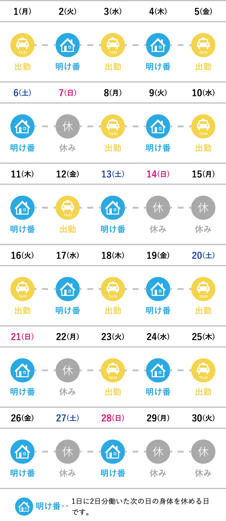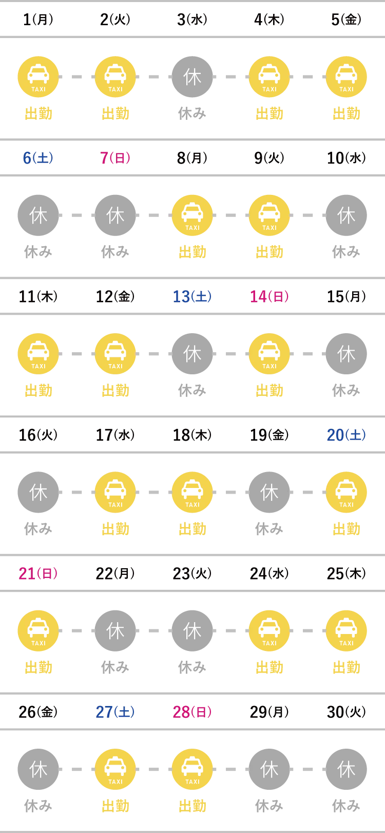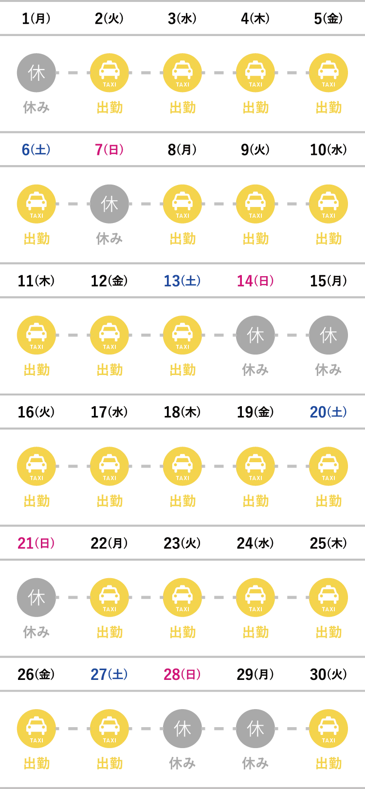 休みは月に6日あります。月間で50万円以上稼ぐドライバーさんもおられるため、稼ぎたい人は頑張れば頑張るほど稼げる働き方です。休みたい曜日は自身で決めて頂きます。 決めて頂いた休みの翌日が2週間に1日休みになります。